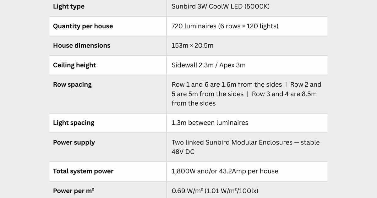 Achieving 83% uniformity in a low-ceiling, large-footprint structure is an exceptional result. Industry best practice for commercial poultry lighting targets a minimum uniformity of 0.6 (60%). Sunbird's 6-row configuration at Tahila Broilers nearly doubles this minimum, ensuring every bird across the full house floor receives consistent light stimulation.